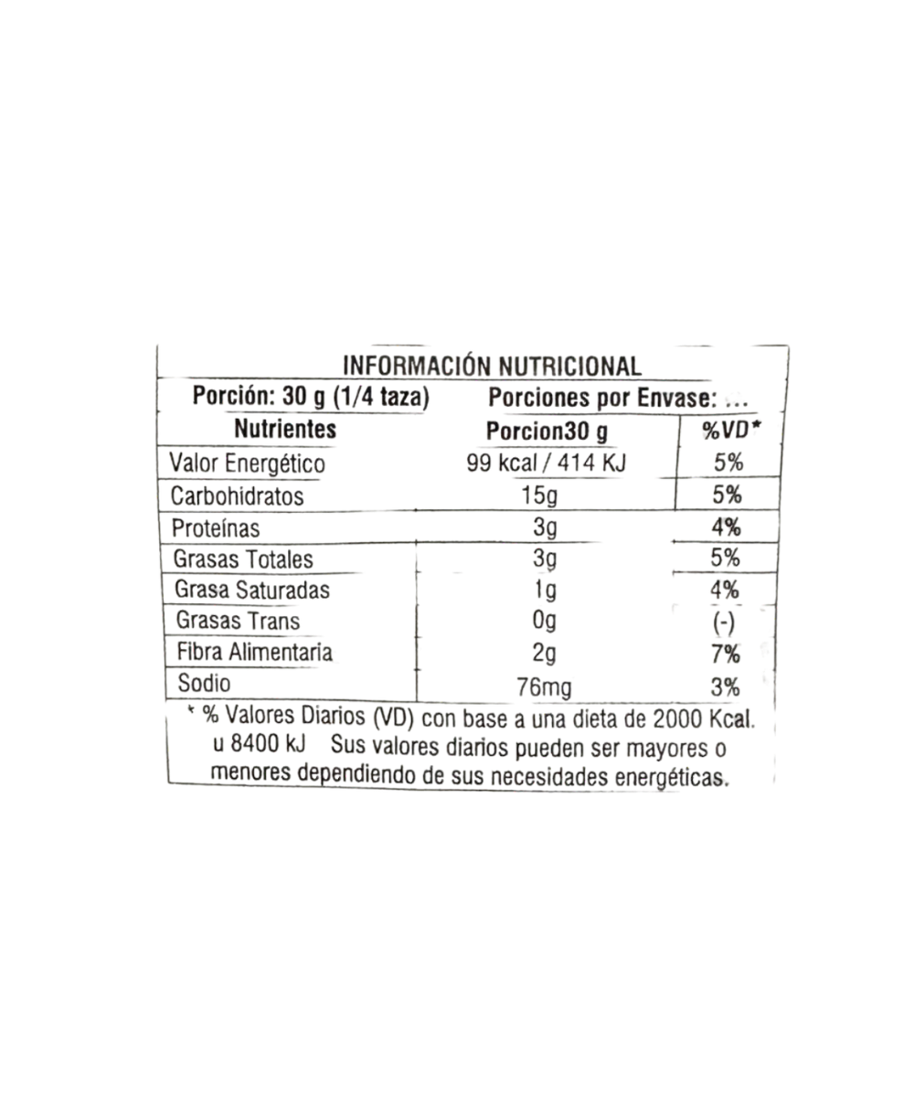 INGREDIENTES: Avena gruesa, copos de maíz sin azúcar, arroz inflado, pasas de uva sin semillas, manzana deshidratada, arándanos rojos deshidratados, semillas de girasol pelado, semillas de sésamo integral, semillas de chía, miel.