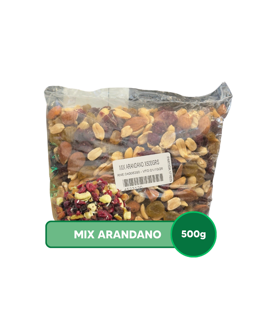 Arándano (Cranberry Deshidratado): Este ingrediente le da el nombre al mix y aporta el toque distintivo de acidez y antioxidantes, equilibrando el dulzor de las pasas.
