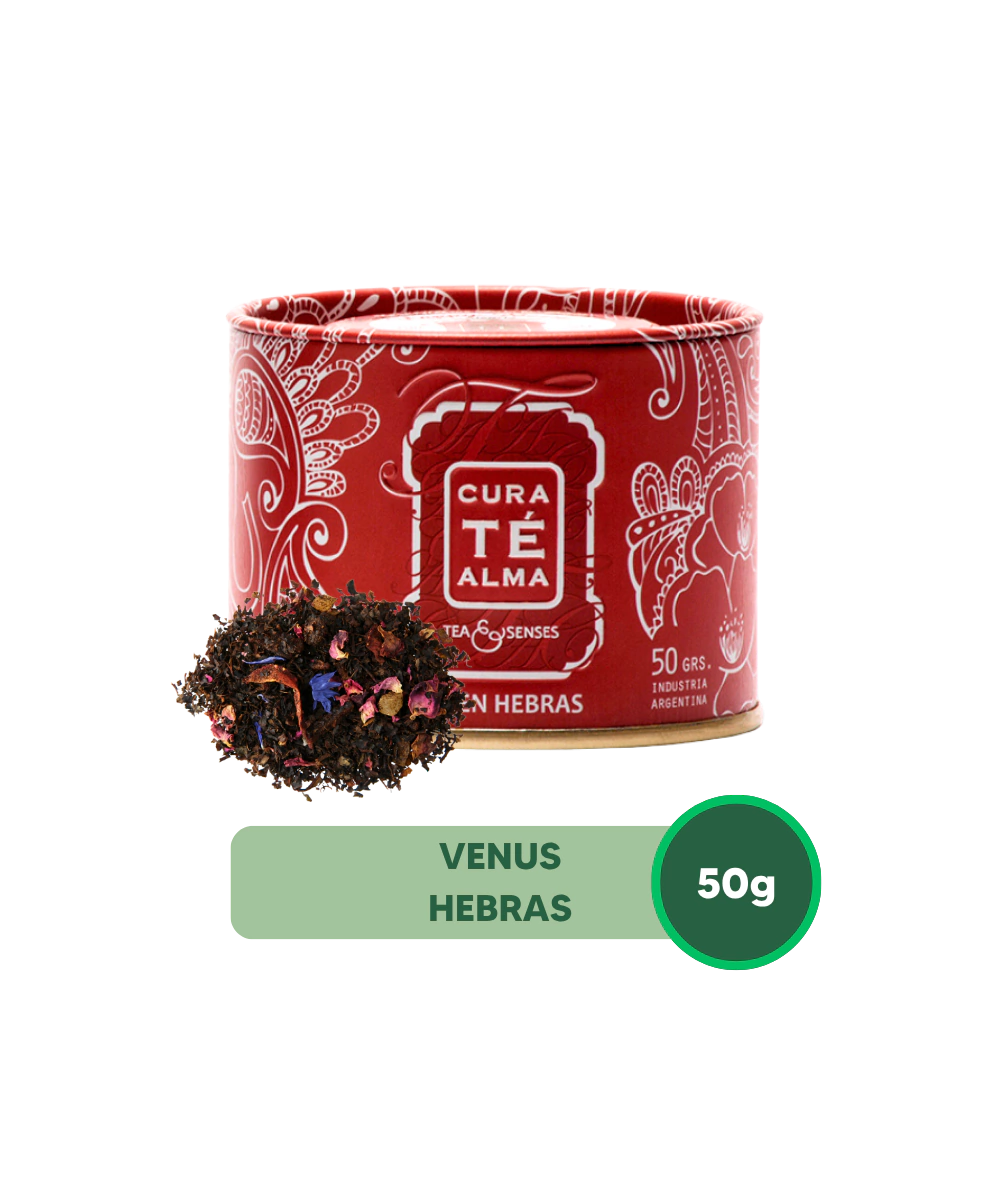 El "Venus" es un blend de té en hebras de la marca Cura Té Alma, identificado con la virtud del "Amor". Se presenta en una Lata Premium de 50 gramos. Es una mezcla diseñada para ser dulce, afrutada y ofrecer un impulso de energía.